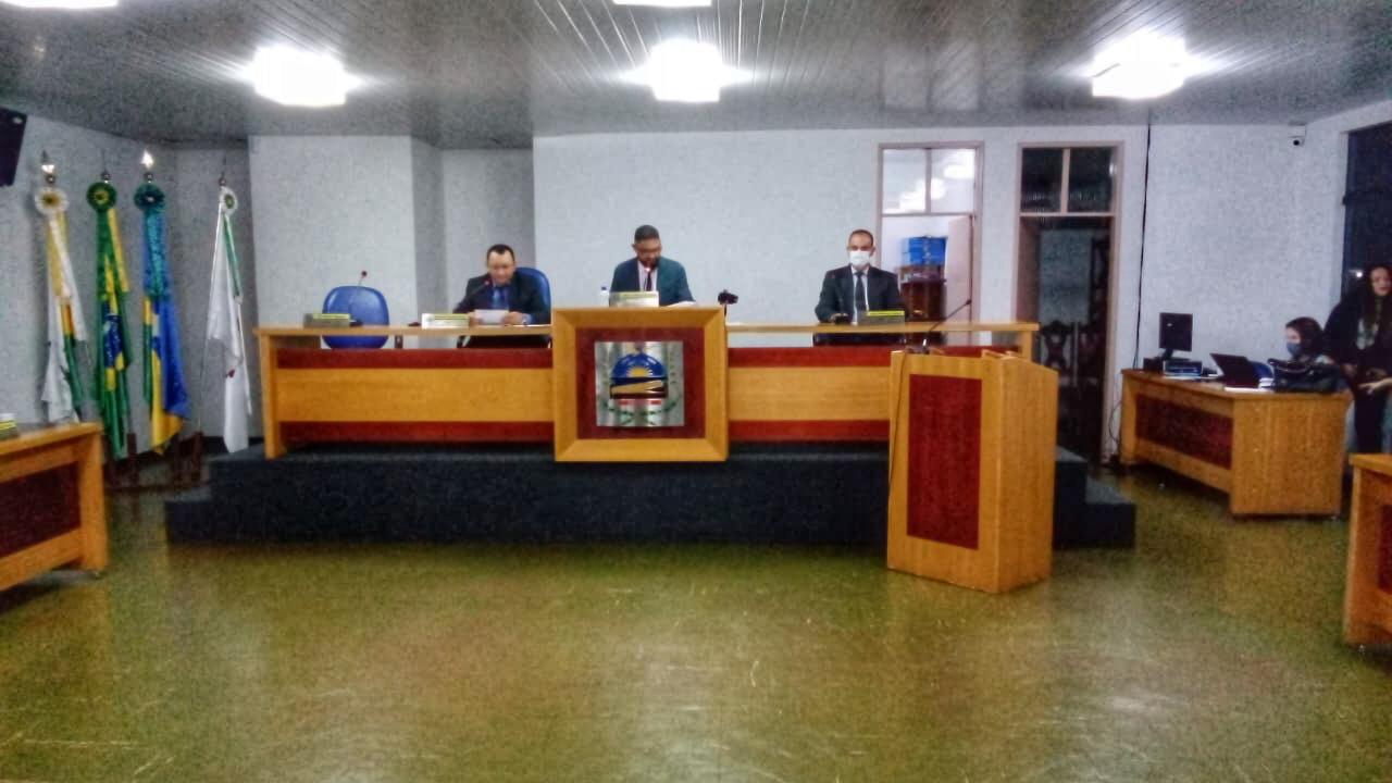 Mesa diretora presente: Vereador Reinaldo Brum, Vereador Presidente Samuel Carvalho, Vereador Isair Baldin.