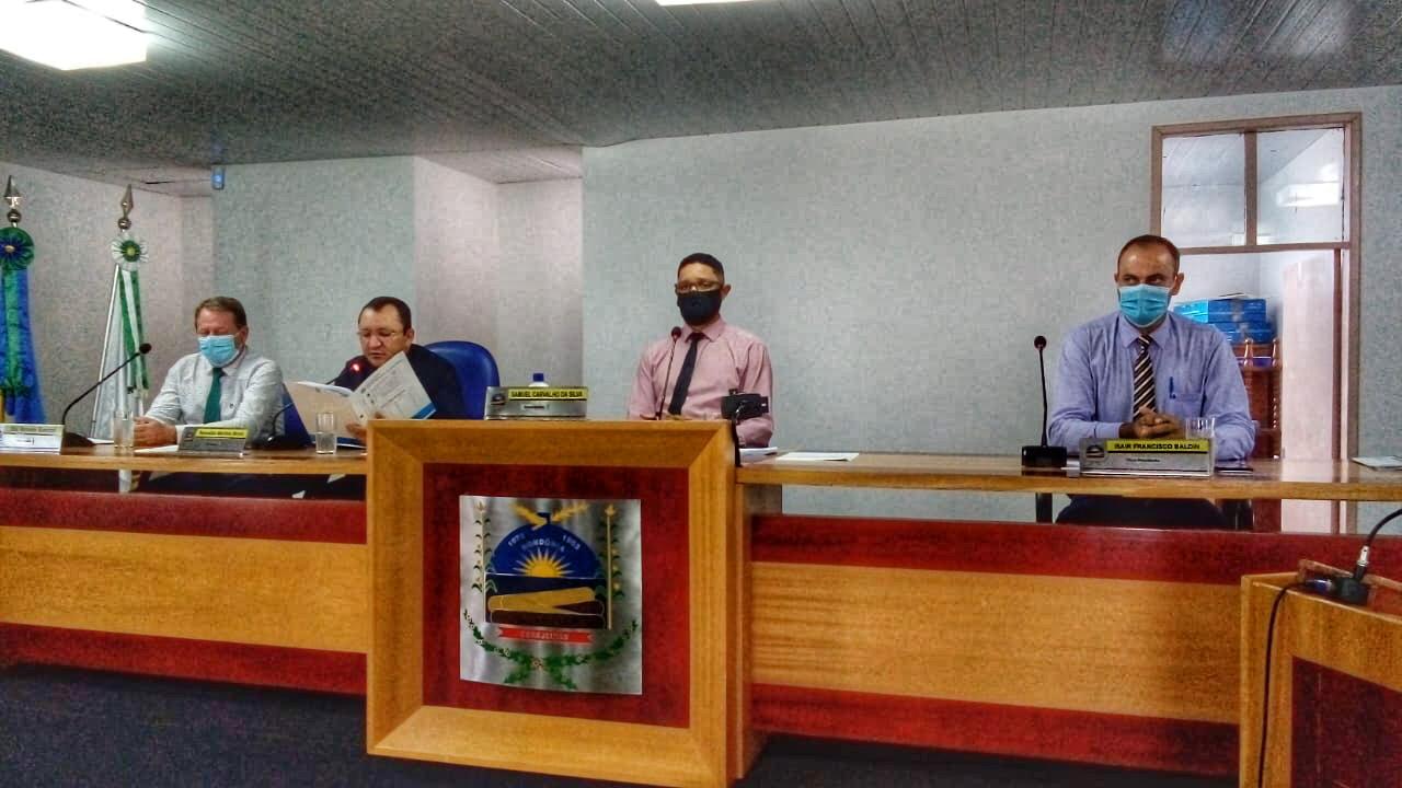 Mesa Diretora - 2° Secretario Elói Ronsani, 1° Secretario Reinaldo Brum, Presidente Samuel Carvalho, Vice-Presidente Isair Baldin.